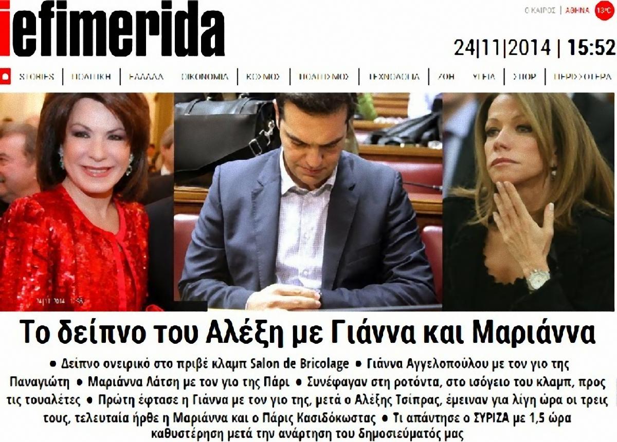 Για «δείπνο του Αλέξη (Τσίπρα) με Γιάννα (Αγγελοπούλου) και Μαριάννα (Λάτση) σε πριβέ κλαμπ στο Κολωνάκι» έγραψε το σάιτ του Χρήστου Ράπτη και έγινε το έλα να δεις. Πρώτος αντέδρασε ο διευθυντής του πολιτικού γραφείου του Τσίπρα, Νίκος Παππάς που χαρακτήρισε προβοκατόρικο όχι το δημοσίευμα αλλά το ίδιο το σάιτ iefimerida. Συγκεκριμένα ο Ν. Παππάς μέσω twitter σχολίασε: